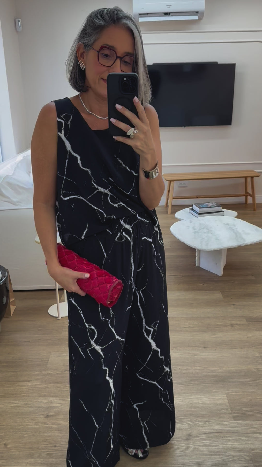 Conjunto Carrara Nero EZILDINHA é produzido em viscose, um tecido fluído, leve e com toque texturizado. Composto por blusa com decote canoa, sem mangas.