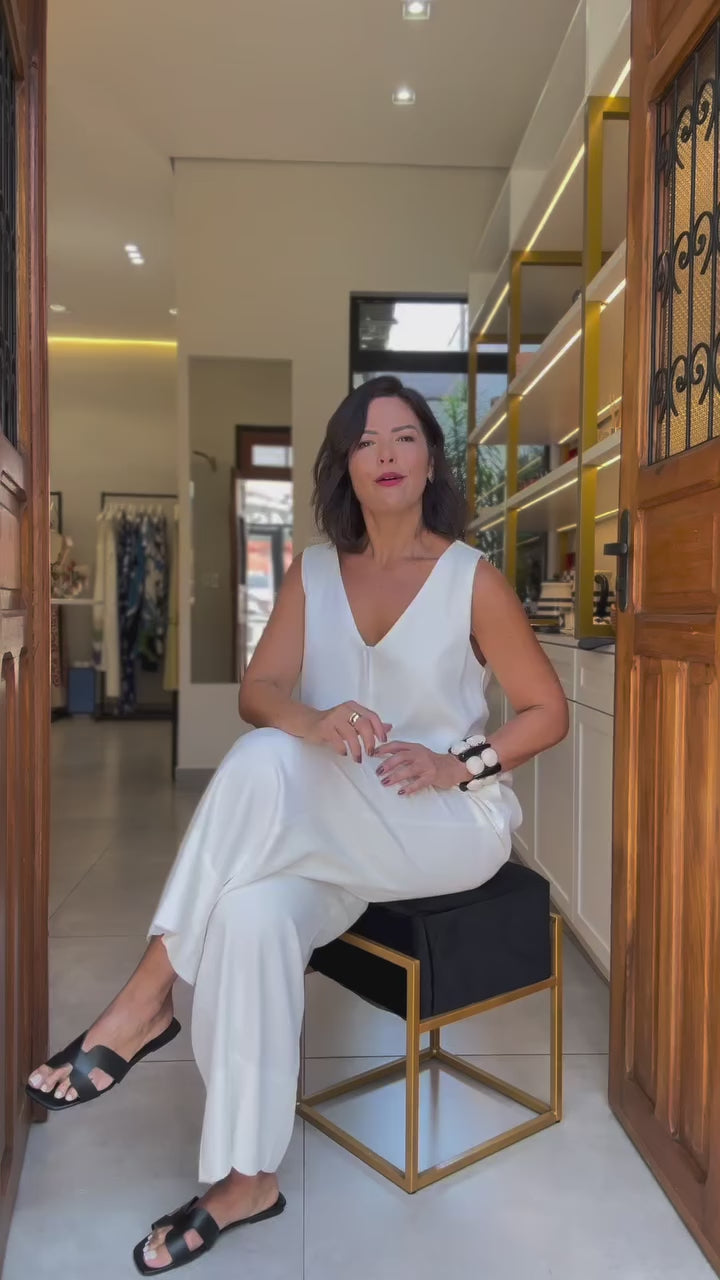 Além disso, macacão possui uma modelagem ampla, que transmite confiança e elegância.