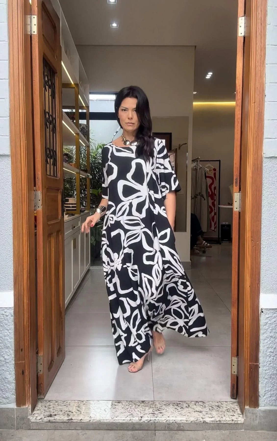 Vestido amplo com mangas 3/4, que respeita a liberdade da mulher moderna, combinado com a delicadeza da estampa floral, formando uma peça sutil e ao mesmo tempo de forte presença visual, compondo com praticidade um look expressivo e confortável ao mesmo tempo.