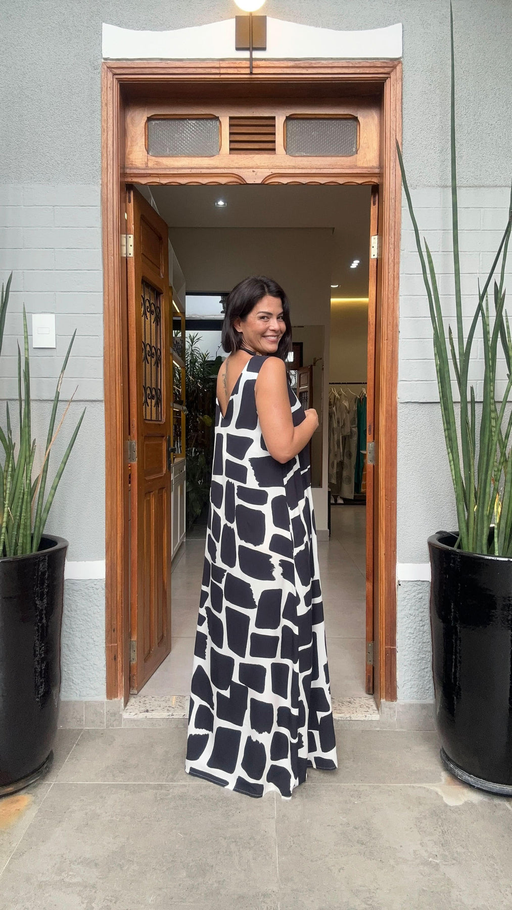 O vestido estilo regata com comprimento longo é a junção perfeita, transmite a feminilidade, frescor, associados a um caimento elegante onde podem ser usados em diversas ocasiões. Estampado com elementos sinuosos que trazem fluidez e movimento combinados ao aconchego das formas de pedrinhas.