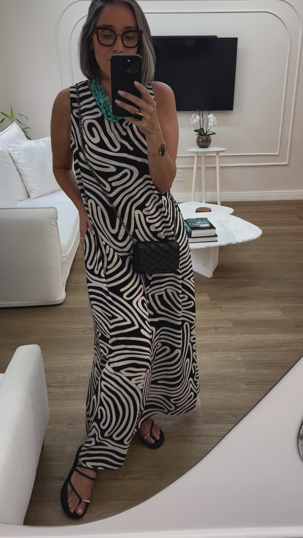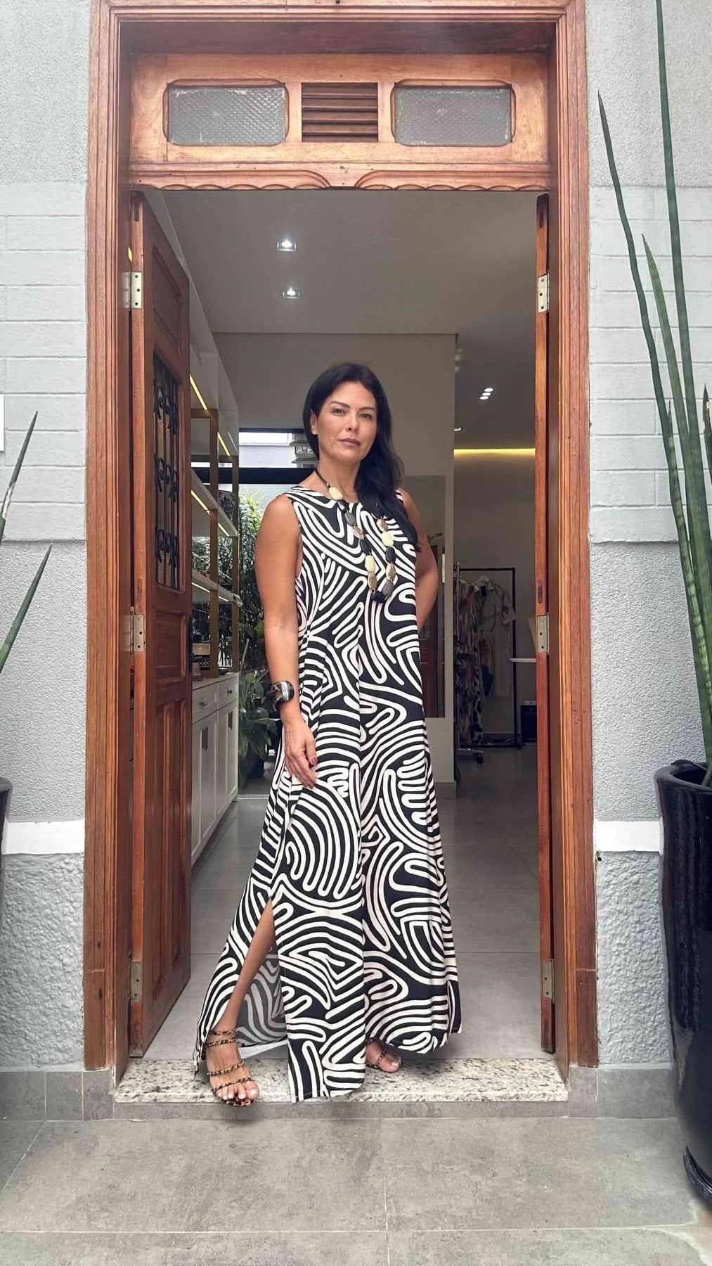 O vestido estilo regata com comprimento midi é a junção perfeita, transmite a feminilidade, frescor, associados a um caimento elegante onde podem ser usados em diversas ocasiões. Estampado com elementos sinuosos que trazem fluidez e movimento combinados ao aconchego das formas naturais orgânicas.