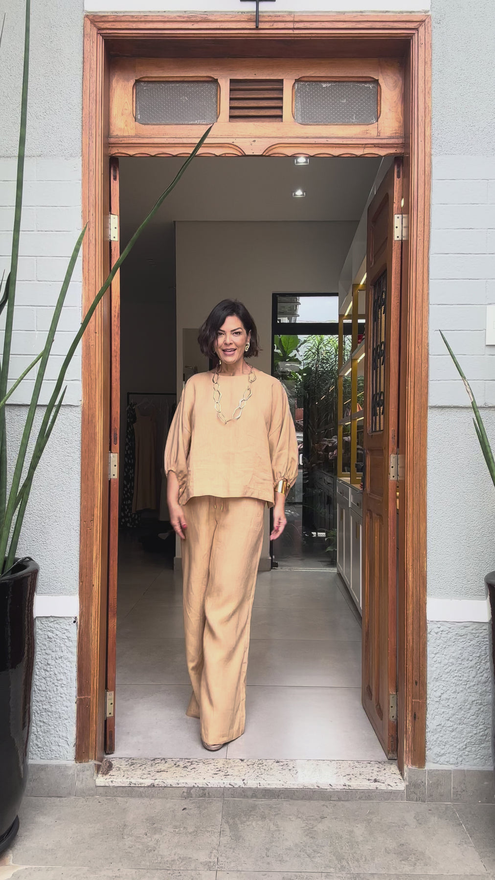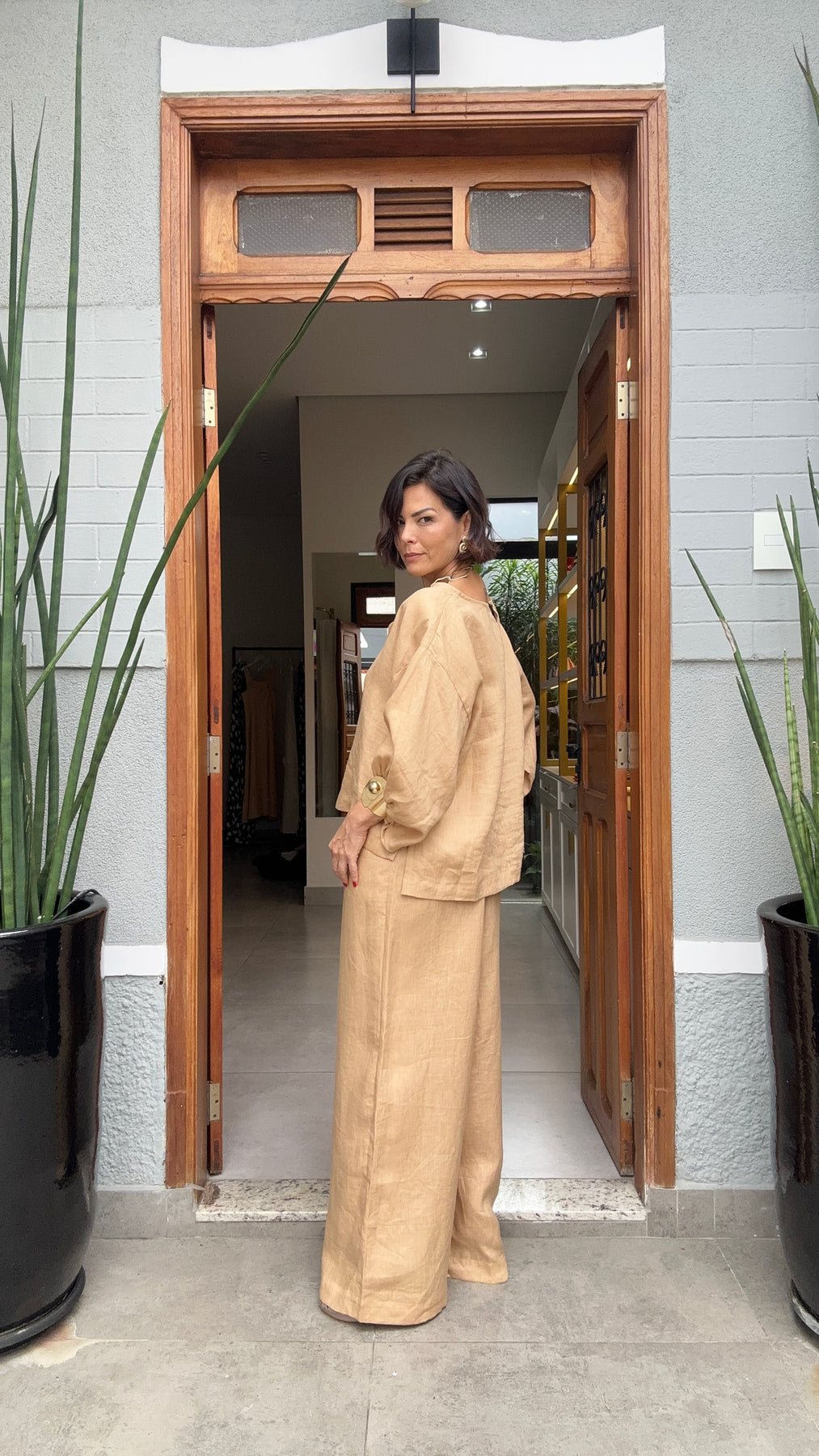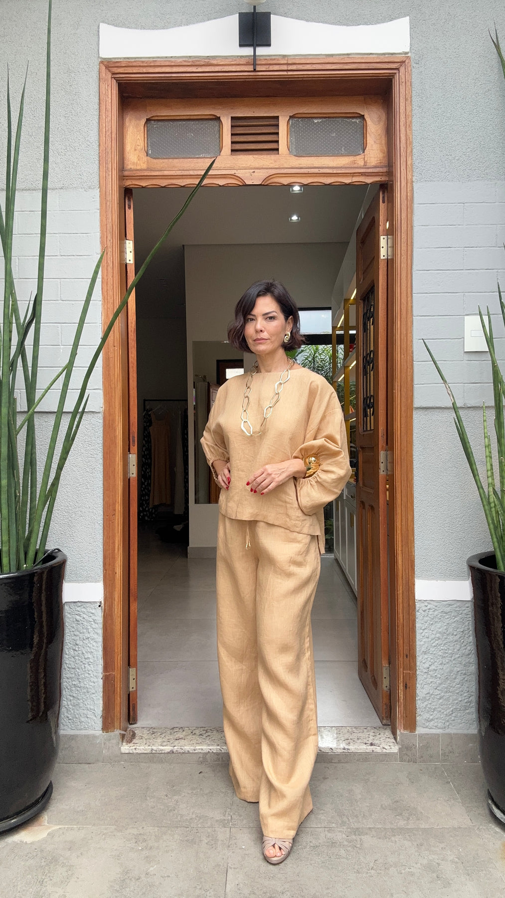 Elegante e descomplicado, o Conjunto Biella em Linho Puro traduz a sofisticação natural do linho numa combinação que é presença total — blusa oversized de mangas bufantes e calça pantalona de alfaiataria no tom caramelo que harmoniza com tudo. Perfeito para almoços, viagens, eventos culturais ou qualquer compromisso que peça elegância sem esforço. Combine com sandália de tiras de couro, colar de elos grandes e acessórios dourados para um visual contemporâneo e refinado.