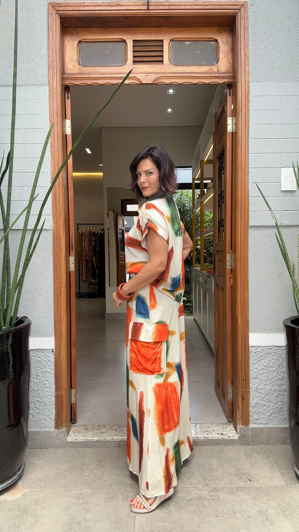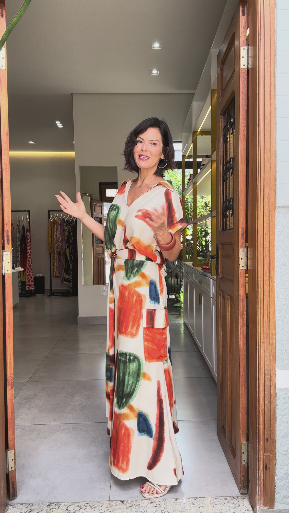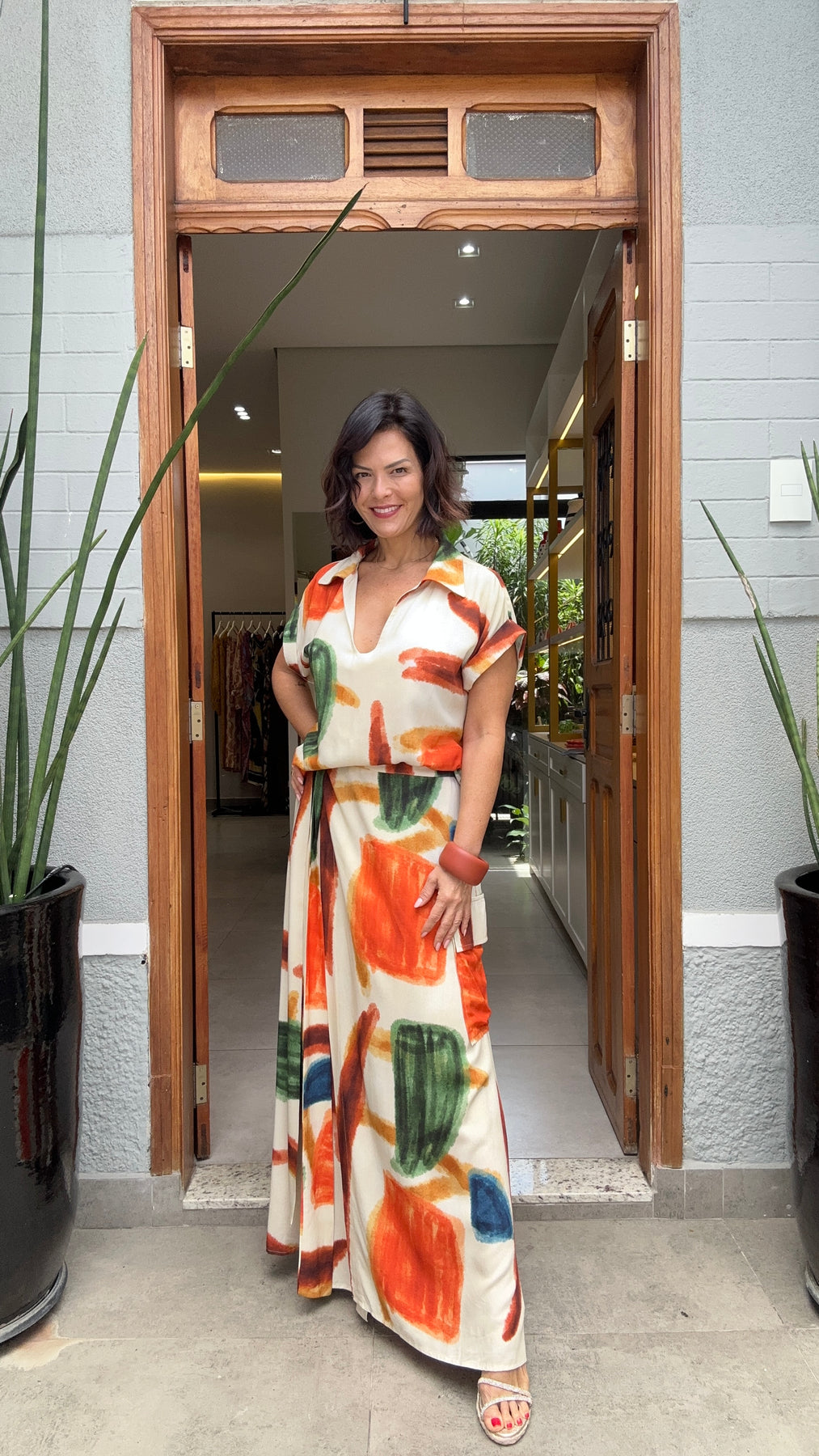 Confeccionado em viscose premium 100%, fibra nobre reconhecida por seu toque sedoso, respirabilidade excepcional e caimento fluido que remete à seda, o Conjunto é composto por blusa oversized contemporânea com gola tipo polo estruturada que adiciona sofisticação casual, mangas curtas amplas tipo kimono que criam conforto e movimento fluido, modelagem solta generosa que não marca o corpo e proporciona frescor absoluto, comprimento que cobre confortavelmente o quadril criando proporções equilibradas, acabamento clean sem botões frontais (modelo pull-on que veste pela cabeça), e estampa Miró vibrante que transforma a blusa simples em peça statement; e saia longa maxi em modelo envelope transpassado sofisticado com amarração lateral ajustável que cria laço decorativo elegante, fenda lateral discreta que permite movimento e adiciona sensualidade sutil, comprimento longo que toca o chão criando alongamento visual dramático, cintura média confortável, caimento fluido evasê que não marca quadris e cria movimento teatral ao caminhar, e acabamento impecável com costura invisível. A estampa exclusiva Miró apresenta pinceladas abstratas expressivas em diferentes tamanhos e formatos orgânicos, criando um efeito de aquarela naturalista que remete às obras do mestre catalão Joan Miró - formas livres, cores vibrantes, composição orgânica que celebra a liberdade criativa. A paleta cromática é estrategicamente vibrante mas sofisticada: laranja coral que traz calor tropical, verde esmeralda que adiciona profundidade elegante, azul petróleo ou royal que cria frescor, marrom terracota e detalhes em amarelo mostarda que completam a composição artística sobre fundo off-white luminoso que permite que as cores brilhem sem competir. O conjunto oferece a versatilidade perfeita - use completo para impacto máximo, ou separe as peças para criar múltiplos looks diferentes com outras peças do guarda-roupa.