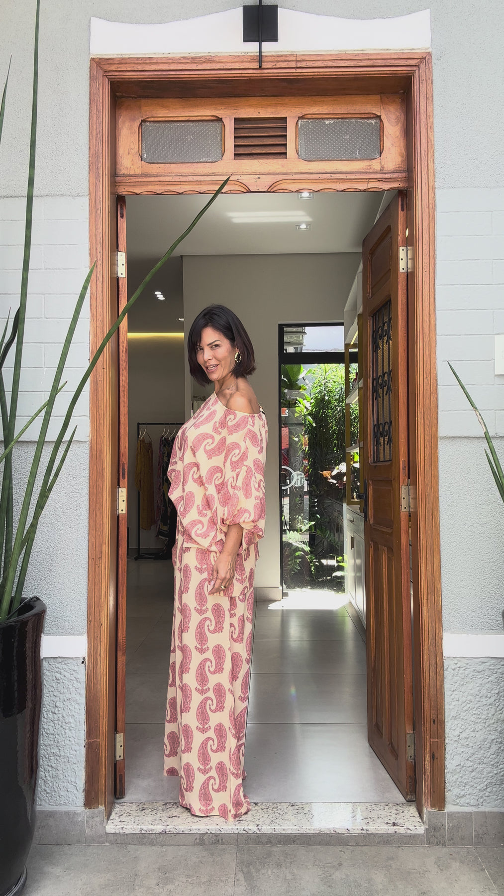 A elegância clássica do paisley em sua forma mais pura e refinada — o Conjunto Paisley da EZILDINHA celebra o mais icônico padrão da história têxtil mundial em uma releitura contemporânea e sofisticada. Confeccionado em 100% viscose de crepe, tecido nobre de toque sedoso e caimento excepcional, o conjunto traz uma estampa exclusiva de grandes motivos paisley em tom rosé terracota sobre base creme pêssego — uma paleta suave e romântica que irradia feminilidade com sofisticação discreta.