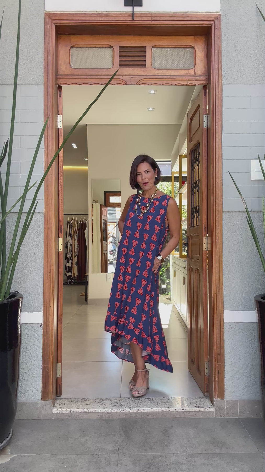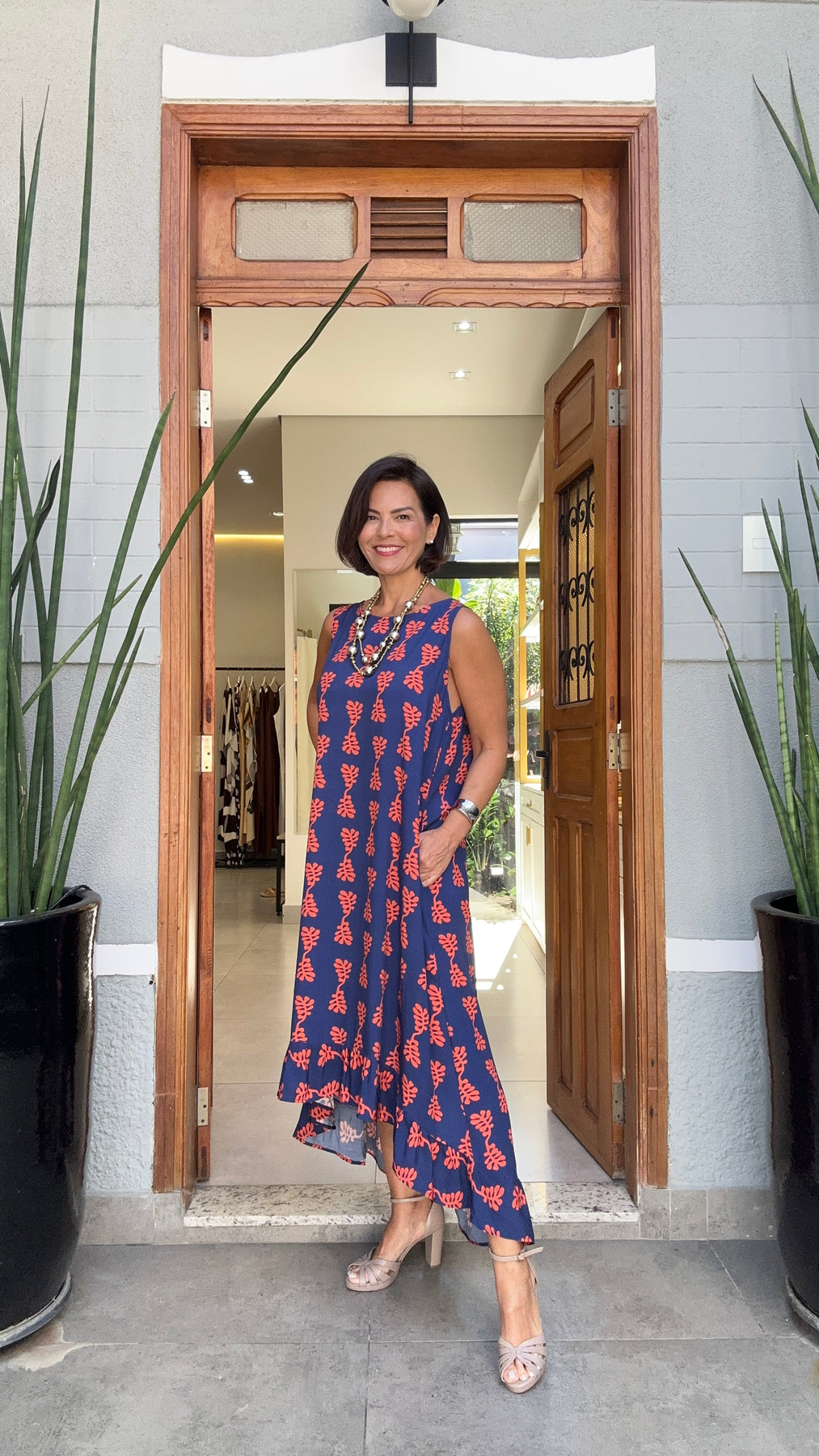 Confeccionado em viscose premium 100%, fibra nobre reconhecida por seu toque sedoso, respirabilidade excepcional e caimento fluido impecável que remete à seda, o Vestido possui modelagem evasê ampla que proporciona máxima fluidez e conforto para todas as silhuetas, comprimento longo mullet (mais curto na frente, mais longo atrás) que cria movimento dramático e alongamento visual elegante, decote redondo amplo que valoriza o colo com simplicidade sofisticada, cavas amplas que proporcionam frescor absoluto e liberdade de movimento nos dias mais quentes, barra com babado delicado que adiciona romantismo e movimento teatral ao caminhar, estampa exclusiva EZILDINHA Havana com ramos botânicos estilizados que remetem às folhagens tropicais caribenhas, dispostos em repetição rítmica sobre fundo azul índigo profundo, paleta de cores vibrante e sofisticada que combina azul índigo/navy como base elegante, coral/terracota vibrante nos motivos botânicos que adicionam calor e energia, criando uma composição que remete aos pátios floridos e à vivacidade cultural de Havana. O design rítmico da estampa cria interesse visual de todos os ângulos, enquanto a disposição vertical dos ramos alonga naturalmente a silhueta e garante uma presença elegante e vibrante. A modelagem evasê proporciona máxima fluidez, movimento gracioso ao caminhar, e conforto absoluto sem restrições, criando uma silhueta alongada e feminina que funciona perfeitamente do dia à noite.