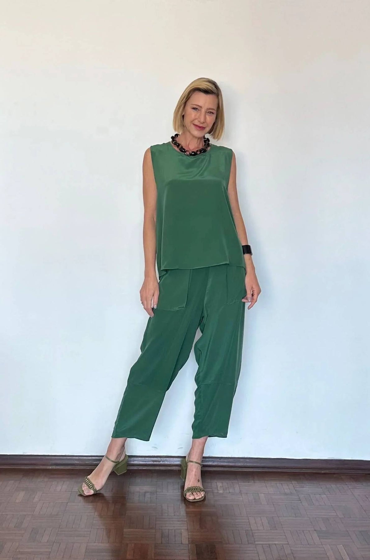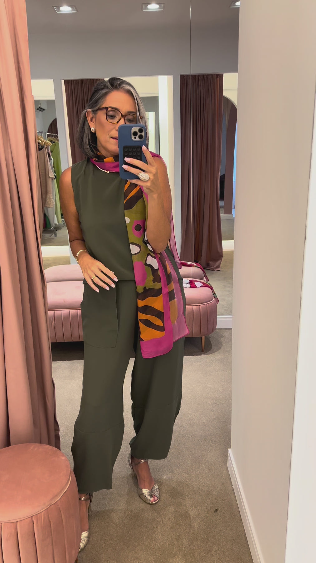 Disponível nas cores Verde Jade e Verde Militar, o Conjunto Laguna foi pensado para a mulher que não abre mão da sofisticação no dia a dia — seja num almoço especial, num evento cultural ou numa tarde de trabalho em que o dress code pede elegância sem rigidez.
