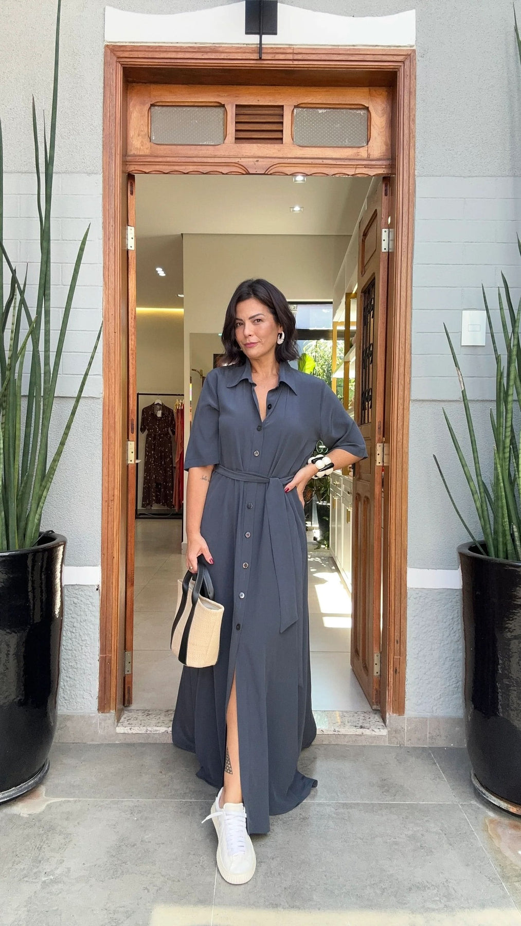 Vestido Chemisier Seda Pura Chumbo — Design Exclusivo EZILDINHA