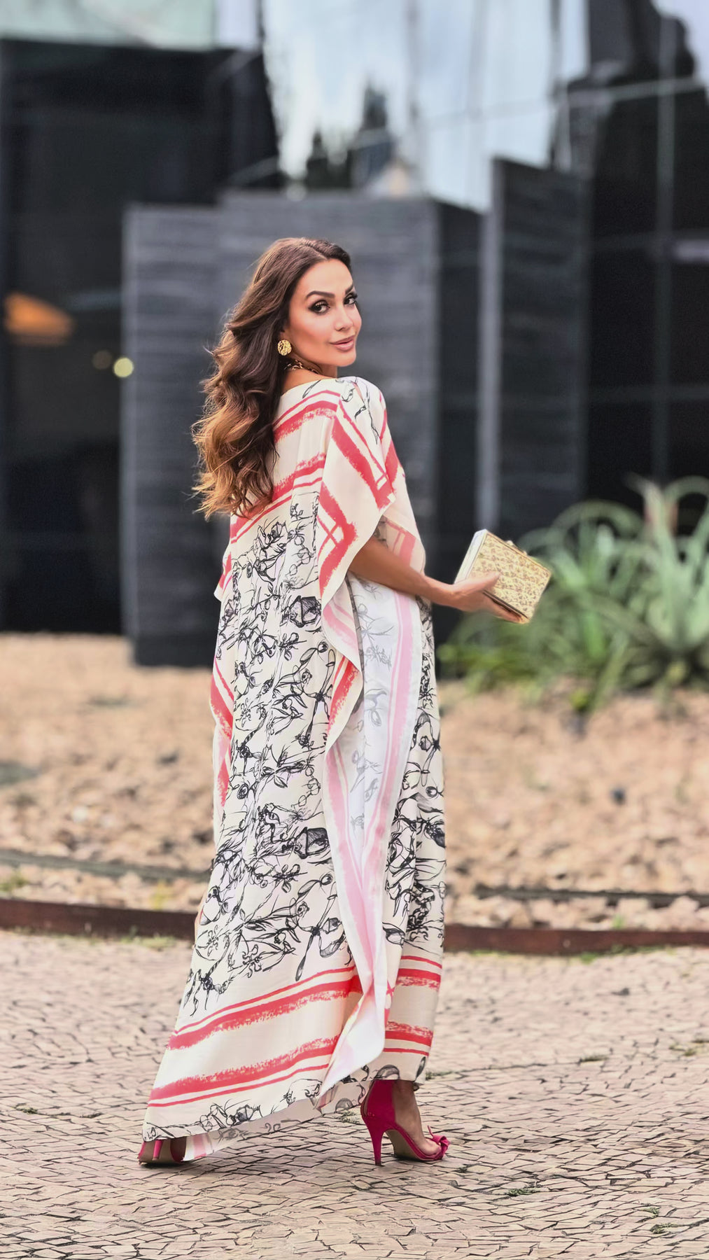 Confeccionado em viscose de crepe, o Vestido Kaftan possui modelagem ampla com caimento fluido e leve, decote em V discreto, mangas amplas estilo kaftan que proporcionam movimento e frescor, comprimento longo, estampa floral tropical exclusiva com flores em tons de rosa, coral, verde e toques de azul sobre fundo suave, acabamento com costura simples nas extremidades.